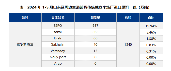 根据相关船期监测数据得出,2024年5月,山东及其周边主要港口的独立炼厂和贸易商接收的俄罗斯原油数量为246.4万吨,环比下降了20万吨,降幅为7.6%。1至5月累计,这些港口接收的俄罗斯原油总量为1340万吨,同比大幅下降了28%。