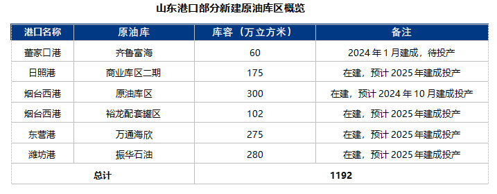尽管山东独立炼厂今年的运营情况较为低迷,但市场依然受到地方政府的支持和刚性需求的保障。山东港口拥有广阔的地炼腹地,近年来仓储、物流建设一直非常活跃。预计2024-2025年,山东港口将有多个原油仓储项目建成投产,包括董家口港、青岛港、烟台港、东营港和潍坊港,预计新增原油库容约1192万立方米,这将进一步提升山东原油的商业储备规模和周转效率。