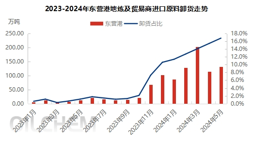 东营地区原油一次加工能力约7000万吨,位居山东之首。尽管东营港之前由于海域条件限制,缺乏大型码头和泊位,未能充分发挥地理优势。但自2023年11月3个10万吨级油品泊位投产以来,东营港的进口原料上岸量显著增加,月均达到100万吨以上,占山东港口整体进口原料上岸比例从2%以下提升至5月的16%以上,展现出明显的后发优势。