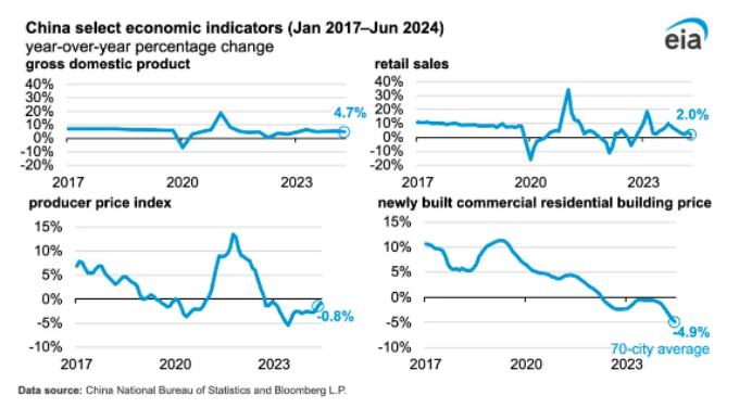 EIA将中国柴油消费量下降的原因归结为两个主要因素:首先是经济活动的减缓,特别是建筑和住房建设的放缓;其次是重型卡车开始采用液化天然气(LNG)作为替代燃料。2024年第二季度,中国的国内生产总值(GDP)同比增长4.7%,略低于5%的目标,且低于疫情前中国的经济增速。零售销售、房价和生产者价格的变化均显示出经济活动放缓的迹象,这与卡车运输活动和建筑业的减缓有关,进而影响了柴油的消费。